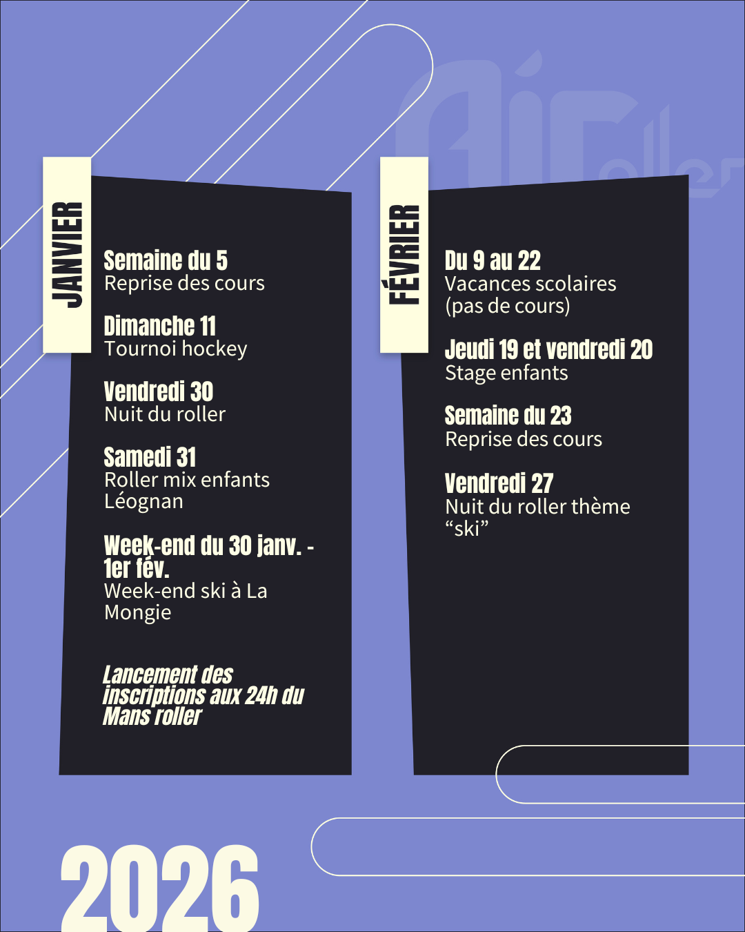 On vous partage le planning des prochains événements, pour vous motiver et repartir du bon patin 💪